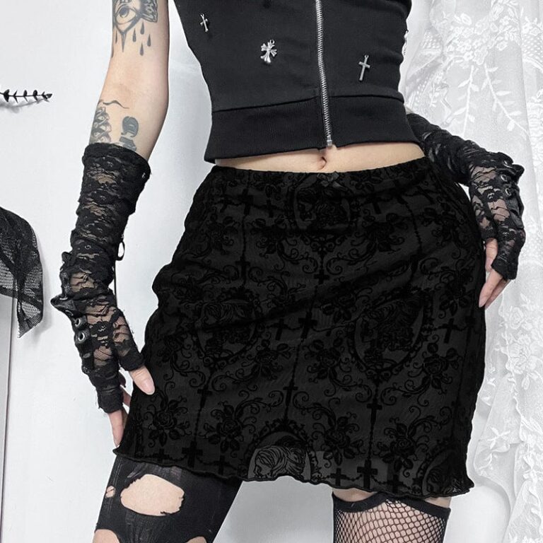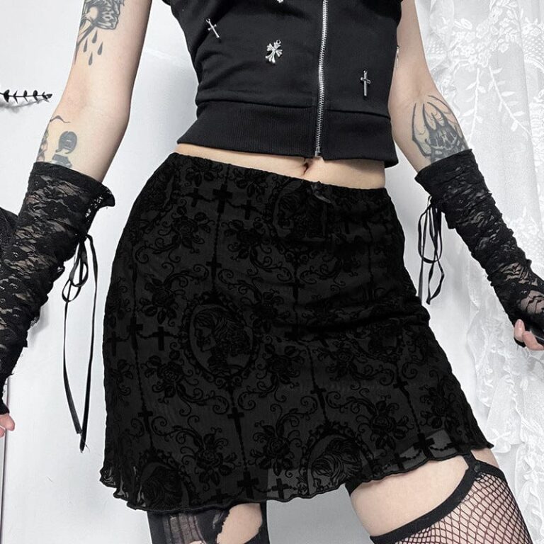 A statement black gothic mini skirt designed for bold, alternative styling.
