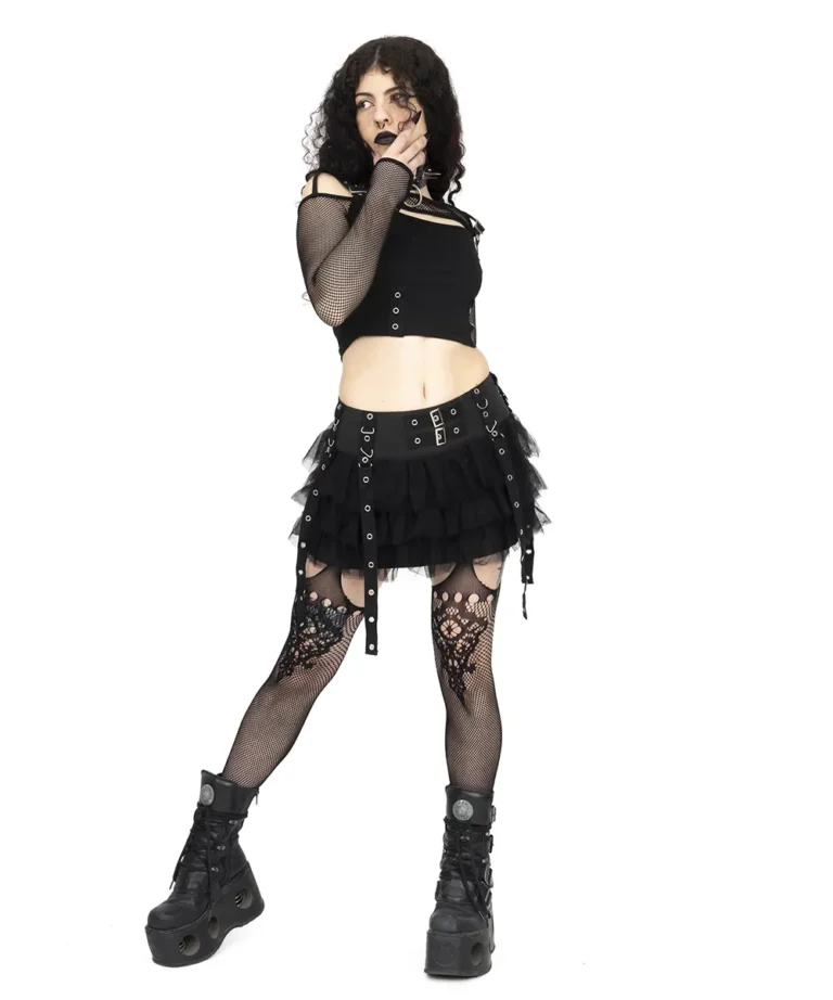 Featuring a full length front zipper closure and structured silhouette, this skirt blends industrial and punk goth aesthetics effortlessly. The metal hardware details and adjustable strap accents add an edgy, underground character, while the clean black base makes it easy to style with graphic tops, mesh layers, corsets or harness pieces.
