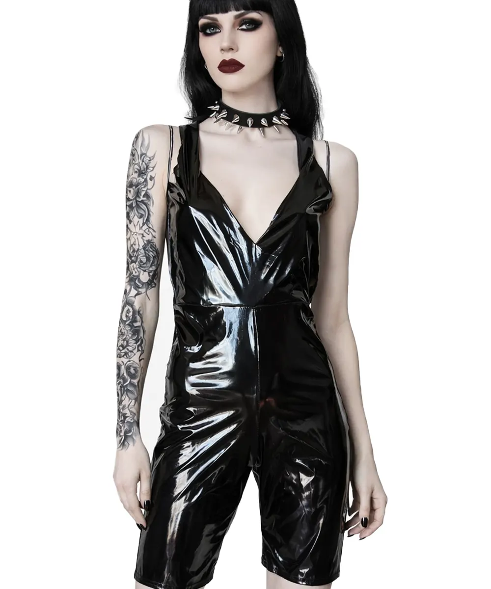 The sleeveless design allows easy layering with mesh tops, harnesses, chokers, or jackets, making it a versatile statement piece for gothic, industrial, and alternative styling. The fitted shorts length cut balances edge with comfort, offering freedom of movement without losing its sharp, commanding presence.