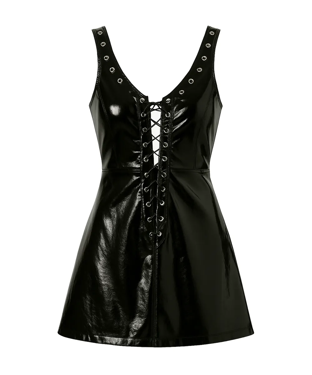 A bold black vinyl mini dress with front lace-up detail and metallic eyelets. Perfect for gothic nights, fetish looks, and dark alternative outfits.