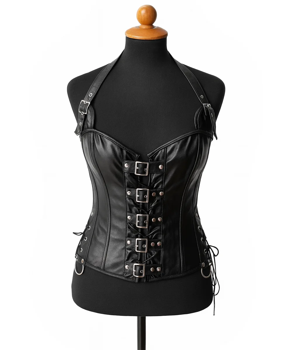 Step into the shadows with this gothic black leather corset top from Demonyx. Designed for those who live and breathe the dark aesthetic, this punk inspired halter corset combines structure, power, and sensuality. Made from soft faux leather with five silver buckles, lace-up sides, and metal details, it creates a bold, figure enhancing silhouette that screams rebellion and confidence.