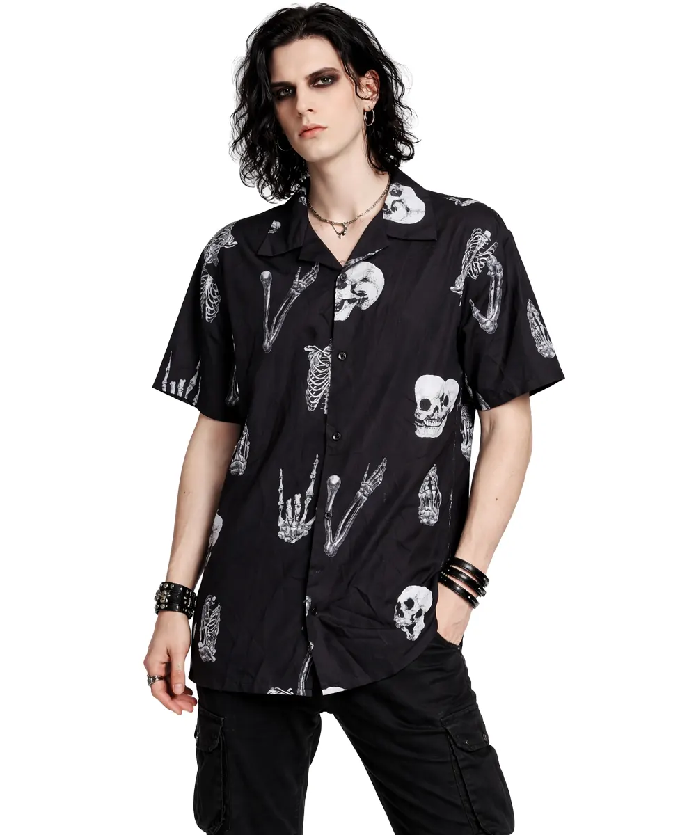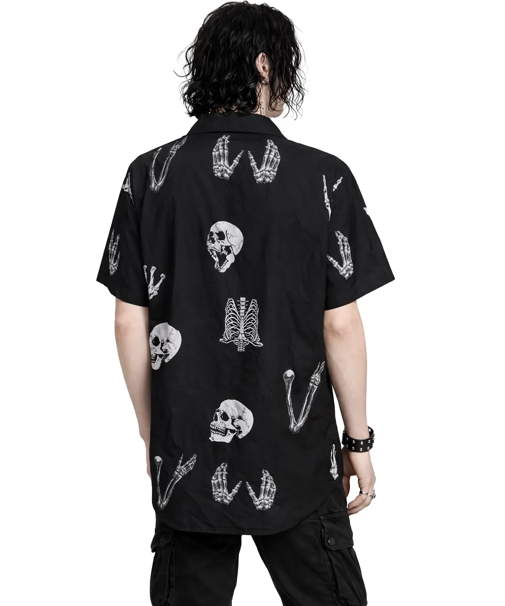 This Vintage Gothic Skeleton Print Shirt is a statement piece for those who live and dress in black. Featuring an all over white skeleton and skull print on a deep black base, this shirt blends classic gothic symbolism with effortless everyday wear.