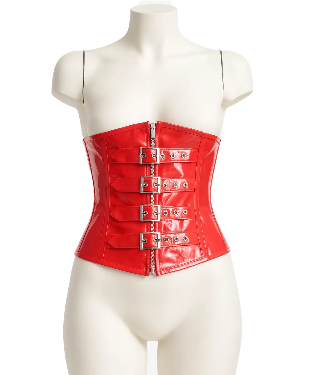 The front features a full length zipper combined with four adjustable metal buckle straps for an industrial, aggressive look. The back includes strong lacing with metal eyelets, allowing you to tighten and contour the corset comfortably to your body. Ideal for clubwear, festivals, photoshoots, or layering over dresses, mesh tops, and harness pieces.