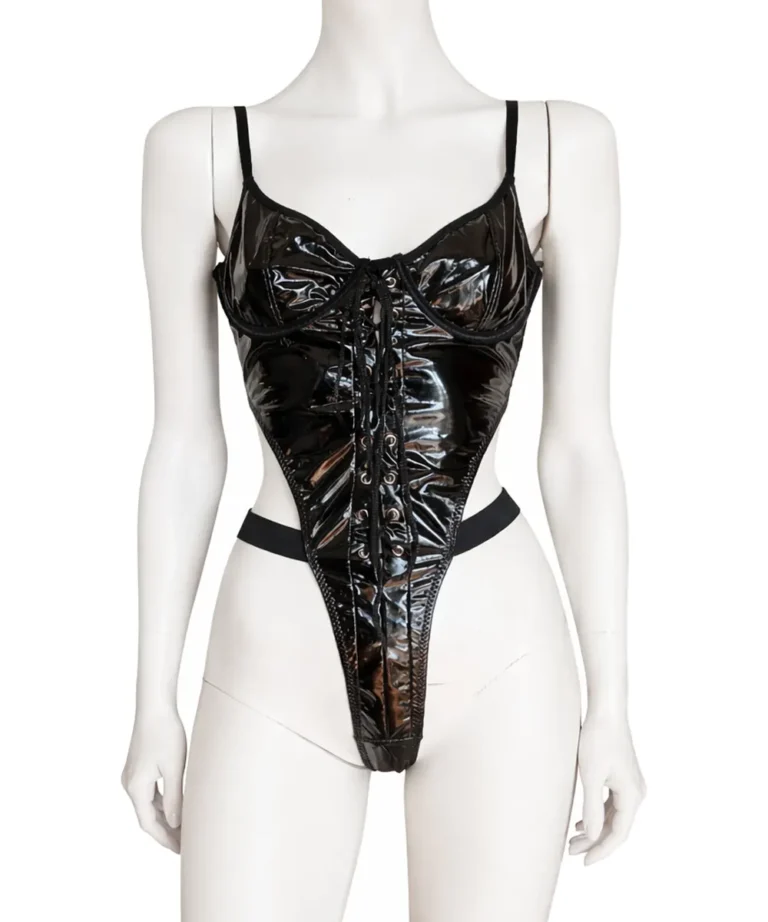 A high shine black vinyl corset designed for bold gothic looks. Features a front zip, metal buckle straps, and adjustable back lacing for a sculpted waist and perfect fit. A signature Demonyx piece.